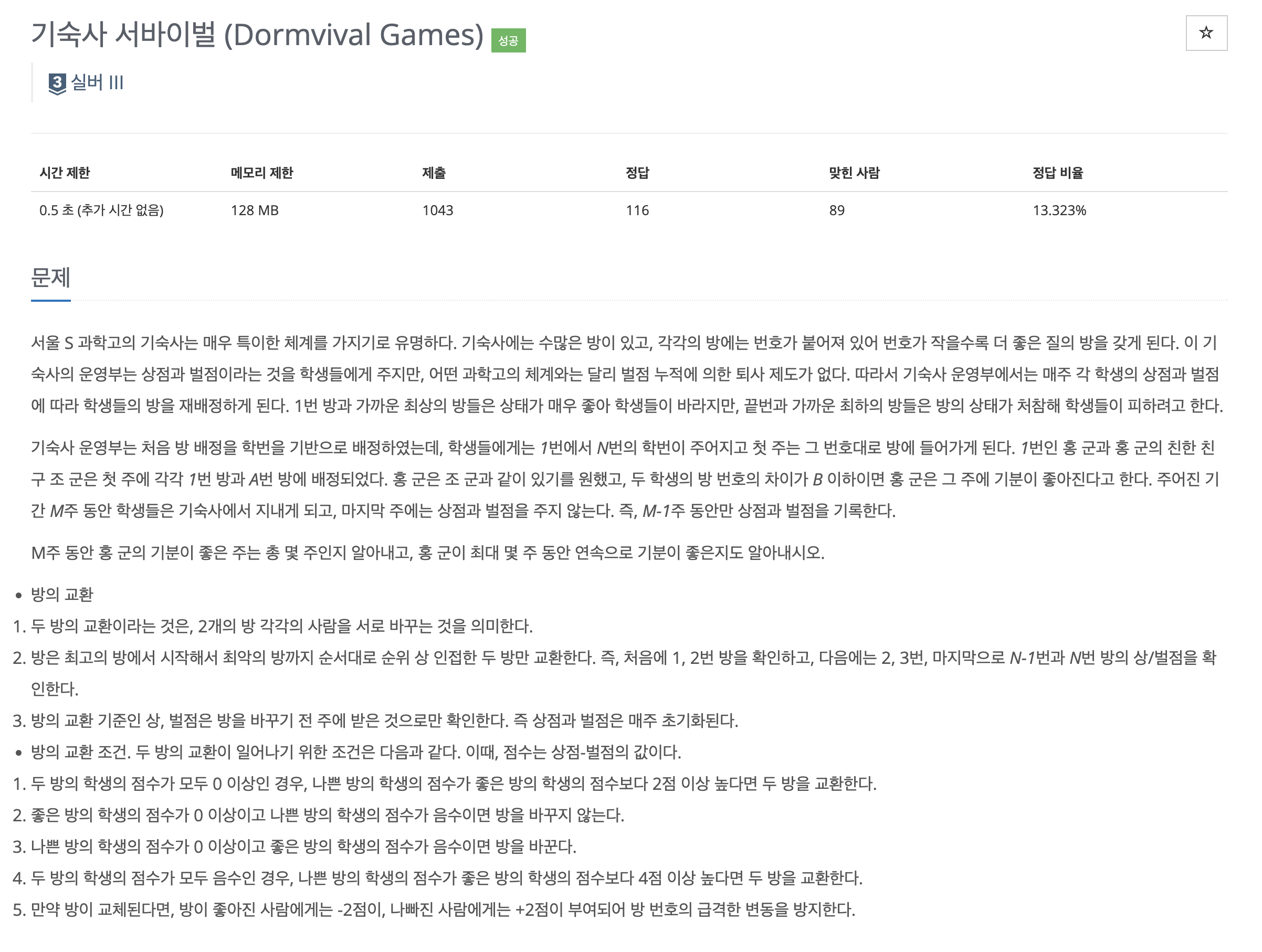 서울 S 과학고의 기숙사는 매우 특이한 체계를 가지기로 유명하다. 기숙사에는 수많은 방이 있고, 각각의 방에는 번호가 붙어져 있어 번호가 작을수록 더 좋은 질의 방을 갖게 된다. 이 기숙사의 운영부는 상점과 벌점이라는 것을 학생들에게 주지만, 어떤 과학고의 체계와는 달리 벌점 누적에 의한 퇴사 제도가 없다. 따라서 기숙사 운영부에서는 매주 각 학생의 상점과 벌점에 따라 학생들의 방을 재배정하게 된다. 1번 방과 가까운 최상의 방들은 상태가 매우 좋아 학생들이 바라지만, 끝번과 가까운 최하의 방들은 방의 상태가 처참해 학생들이 피하려고 한다.