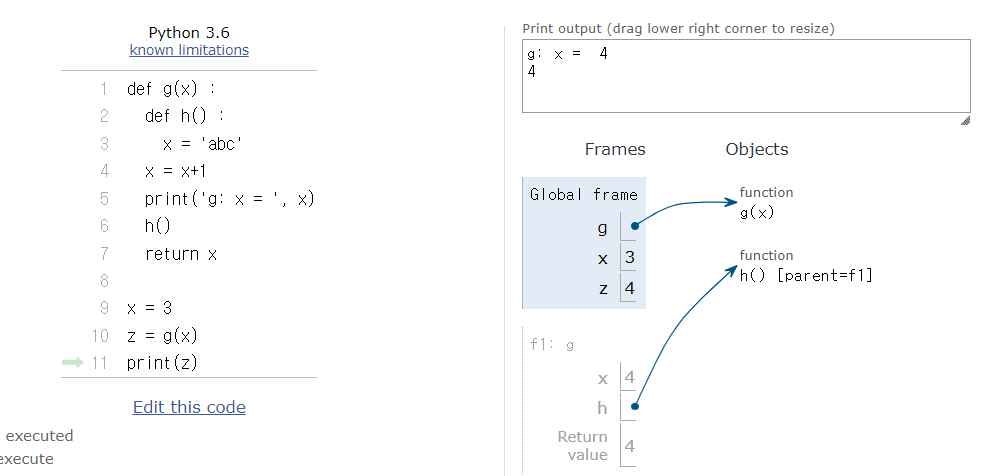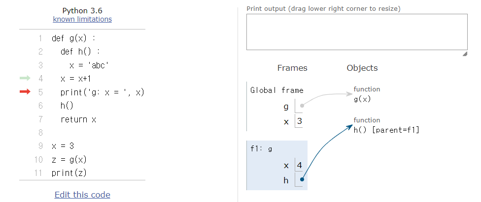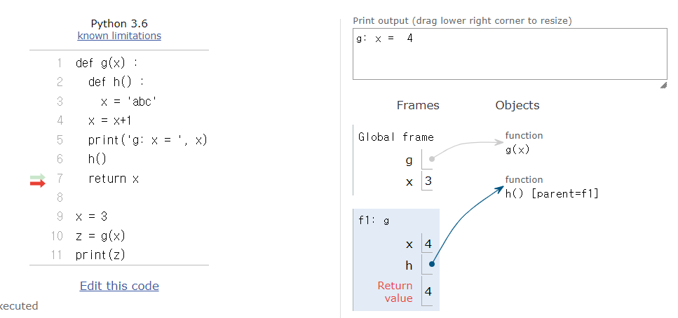 g 함수 내에서 정의된 h함수는 g scope 내에서 h scope를 만들고, 그 함수는 x = 'abc'라는 명령을 수행하도록 정의되었다. x는 x = x+1에 의해 3에서 1 증가한 4가 된다.
