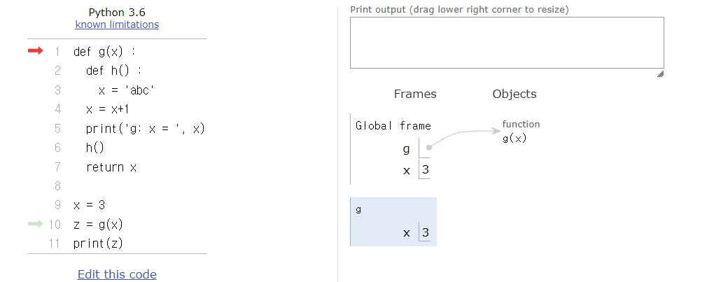 : 앞으로 나올 scope에 대한 사진들은 python tutor 라는 홈페이지에서 프로그램을 돌려본 결과이다. 주소는 다음과 같다.