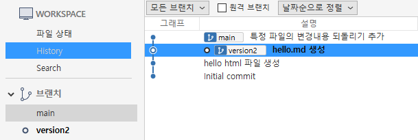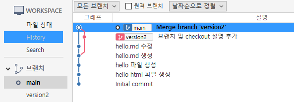 이제 우리는 두 가지 버전이 생겼습니다. main 브랜치 버전과 version2 버전입니다. 각각의 브랜치로 체크아웃하면 각 브랜치의 내용으로 폴더안의 파일이 변합니다. 두 가지를 비교해 보고 고민 후에 최종적으로 하나를 선택하면 됩니다. 그럴 때 병합(merge)