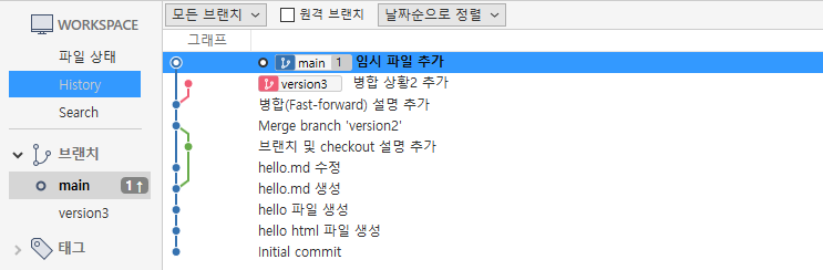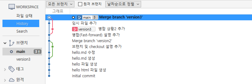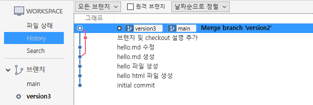 새로운 가지가 생긴 모습을 확인하실 수 있습니다. 이제 두 브랜치를 병합을 해보겠습니다. 마찬가지로 main 브랜치로 checkout을 하고 다음 version3 브랜치를 병합합니다.