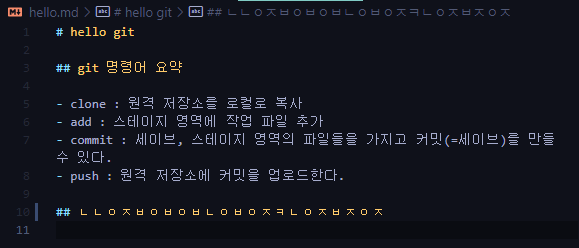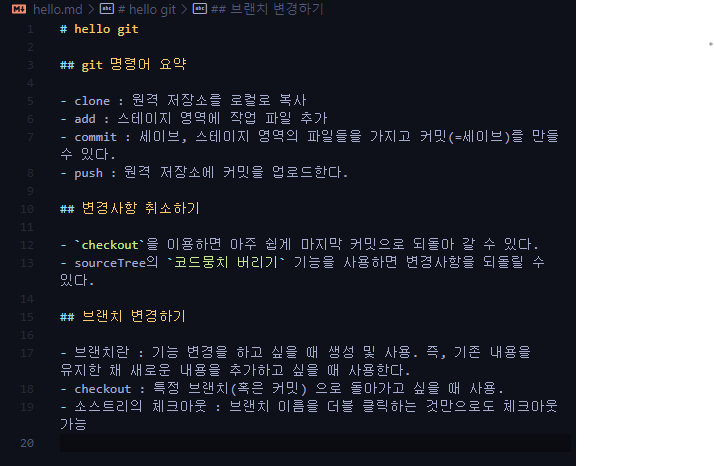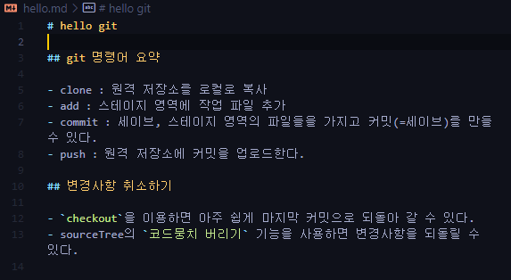 먼저 커밋하고 난 상태에서 아무 파일이나 열고 아무 내용을 입력합니다. 아래 그림은 기존의 hello.md 파일에서 10~14 라인을 지운 후 이상한 내용을 추가해보겠습니다.