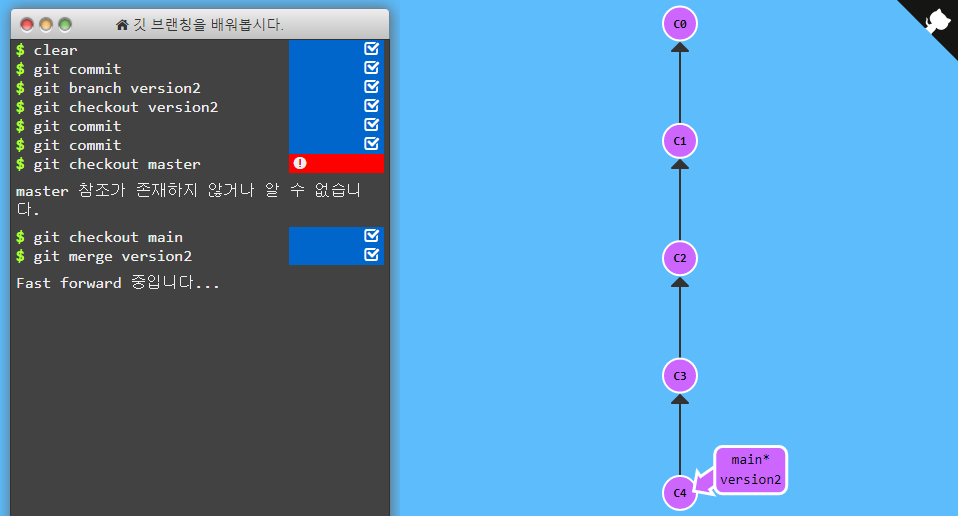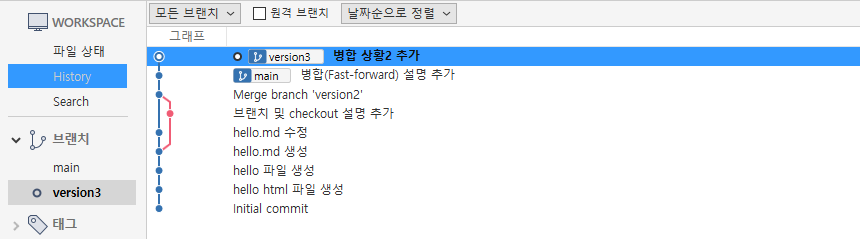 위 그림을 보시면 알겠지만 충돌이 일어나지 않았습니다. 이유는 version3 브랜치가 헤드 브랜치인 main으로부터 시작되었고, 헤드 브랜치에 변경사항이 없었기 때문에 Fast-forward 병합