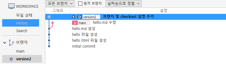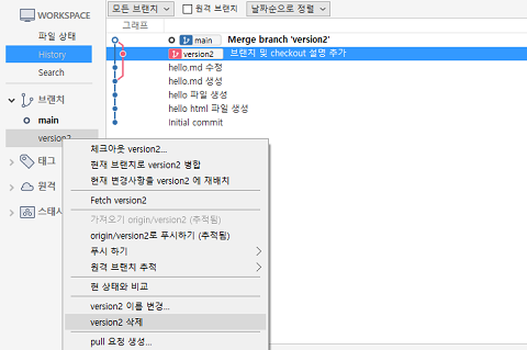 version2 브랜치는 이제 더 이상 필요가 없으니 삭제를 할 수 있습니다. 왼쪽 브랜치 목록에서 version2를 우클릭 후 삭제 버튼을 누르시면 삭제가 됩니다.