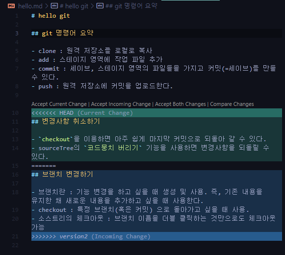 소스트리와 에디터를 사용하면 어렵지 않게 충돌 해결이 가능합니다. 앞서 저희가 편집했던 브랜치들은 가지가 생겨난 경우입니다. 왜냐하면 마지막 커밋의 직전 커밋에서 새로운 브랜치인 version2를 생성했기 때문입니다. 이제 브랜치를 병합해 보겠습니다.