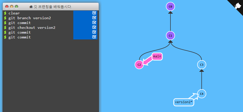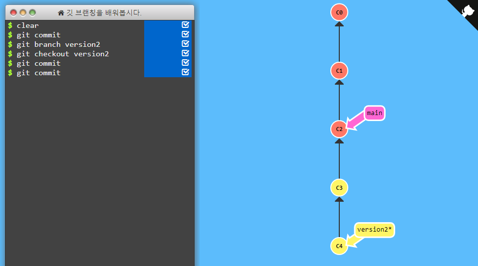 위와 같이 변경한 후에 스테이지에 변경 사항을 올리고 커밋을 하면 새로운 커밋이 하나 생깁니다. 그런데 아래 그림처럼 version2 브랜치만 새로 생긴 커밋을 가르키게 되고, main 브랜치는 변하지 않습니다.