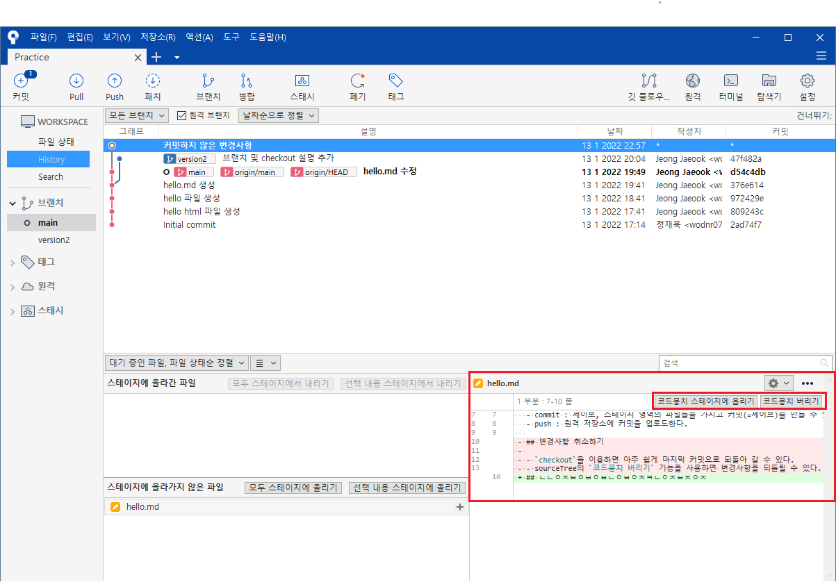 내용 변경 후 sourceTree에 가면 커밋하지 않은 변경사항이 뜨며, 이를 클릭하면 아래 그림과 같이 오른쪽 아래에 hello.md의 변경사항이 나옵니다. 빨간색으로 음영표시 된 부분은 기존의 내용에서 제거된 내용이고, 노란색으로 음영표시 된 부분은 새로 추가된 내용입니다.