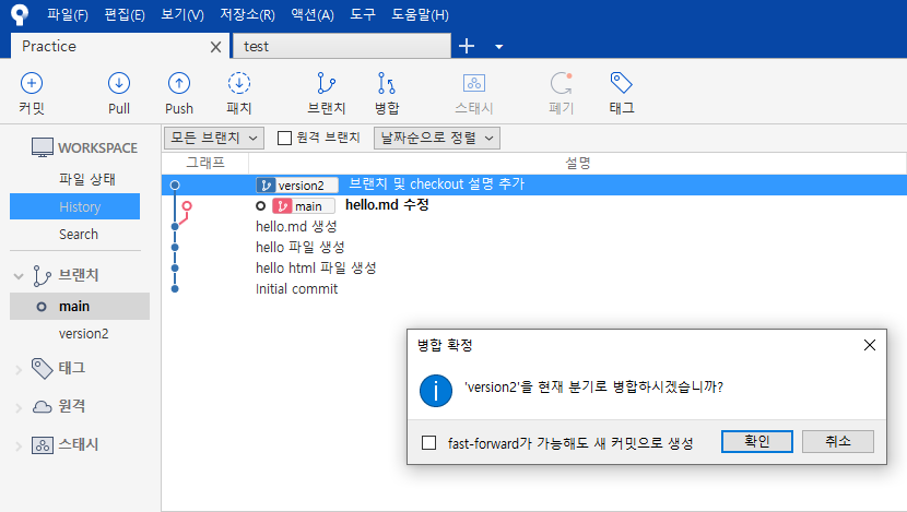 sourceTree를 사용해서 병합하는 방법은, 먼저 헤드 브랜치를 main 으로 checkout합니다. 이후 version2 우클릭 -> 병합을 누르시면 다음과 같은 창이 나옵니다.