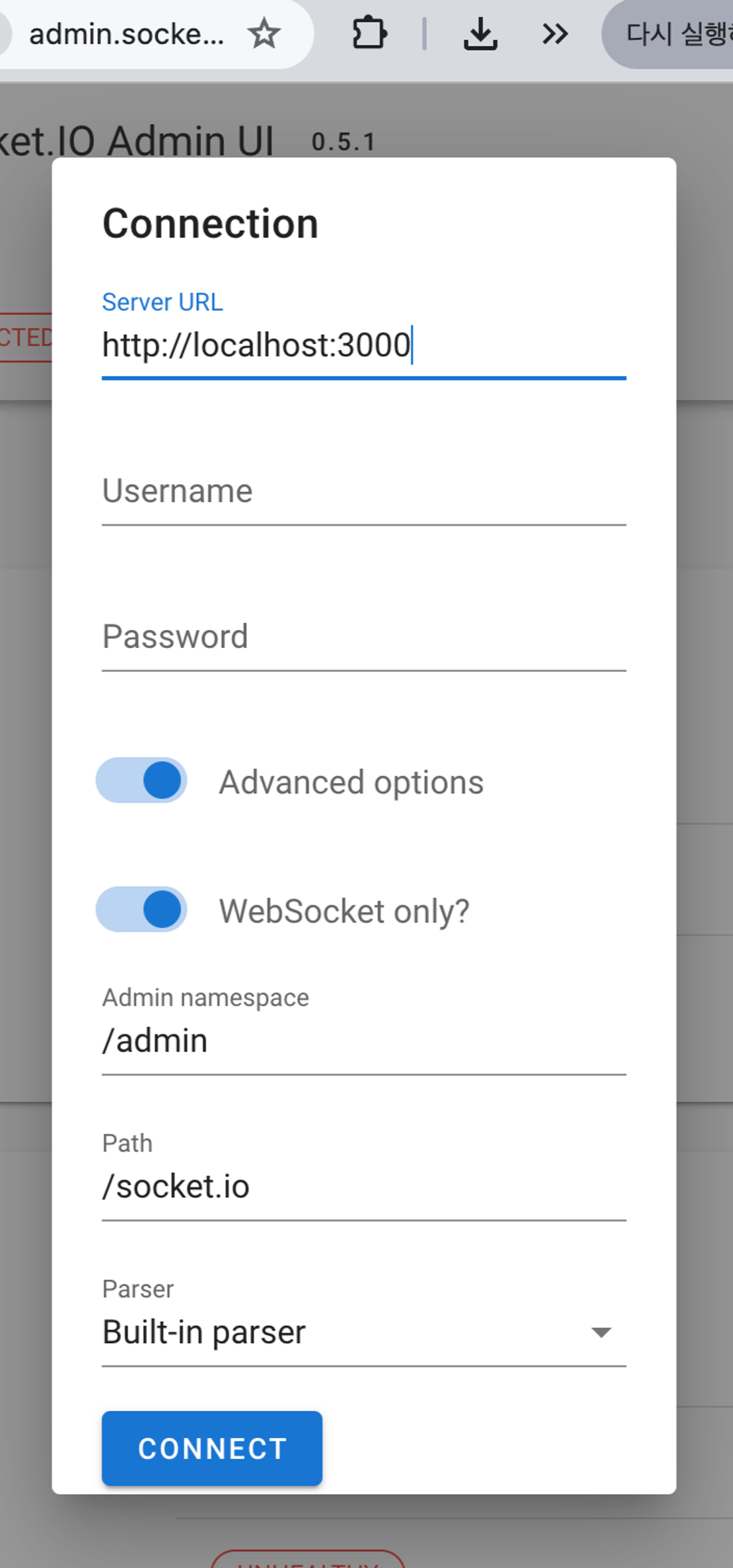 socket.IO 백엔드를 위한 admin UI가 있음! 모든 Room과 클라이언트를 확인할 수 있음.