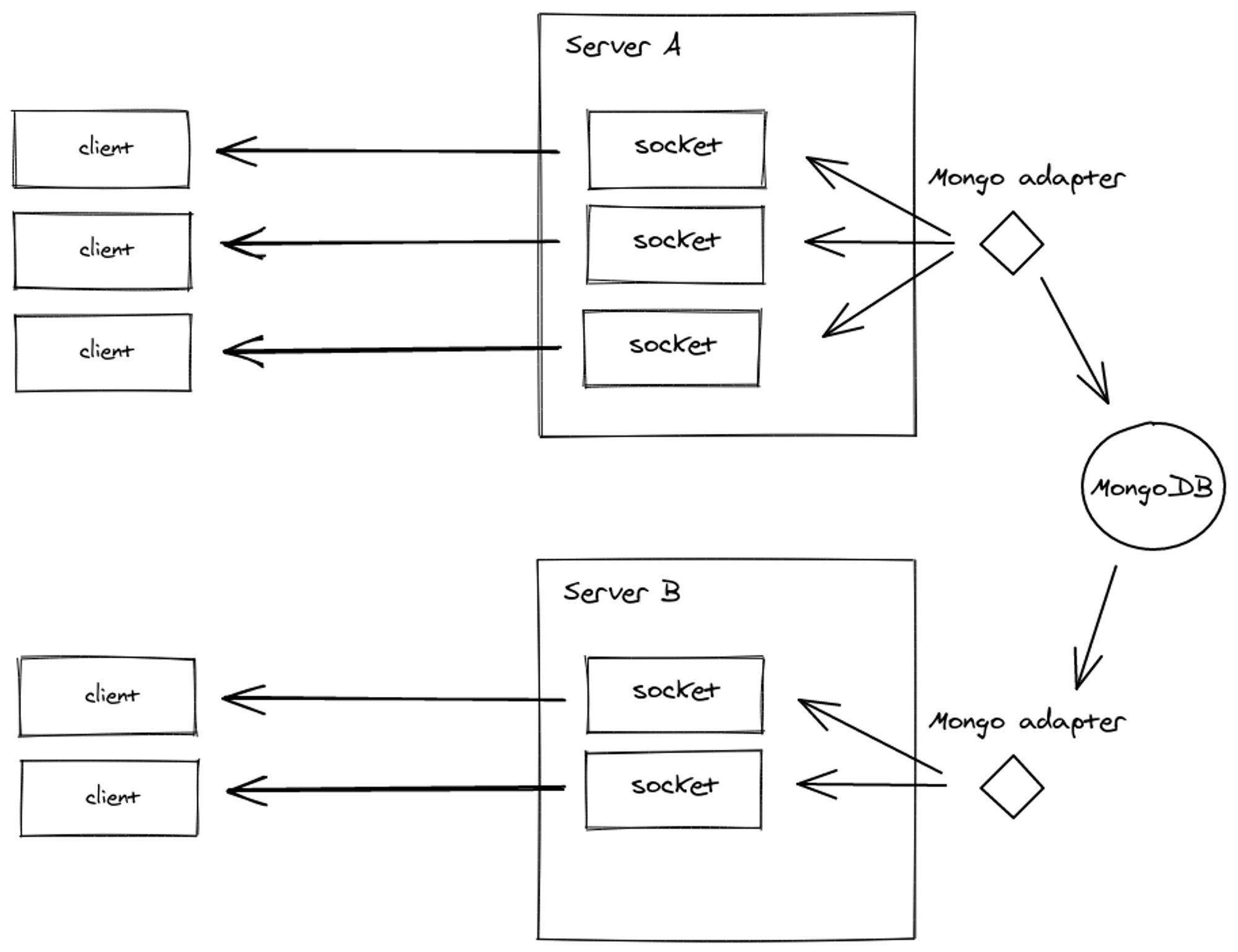 adapter는 몽고디비와 같은 애들을 사용하여 서버간의 통신을 하게 해줌. 서버A에서 서버B로 메세지를 보내려면 서버A에서 adapter와 데이터베이스를 거쳐 다시 adapter로 간 후에 서버B에게 보내짐.