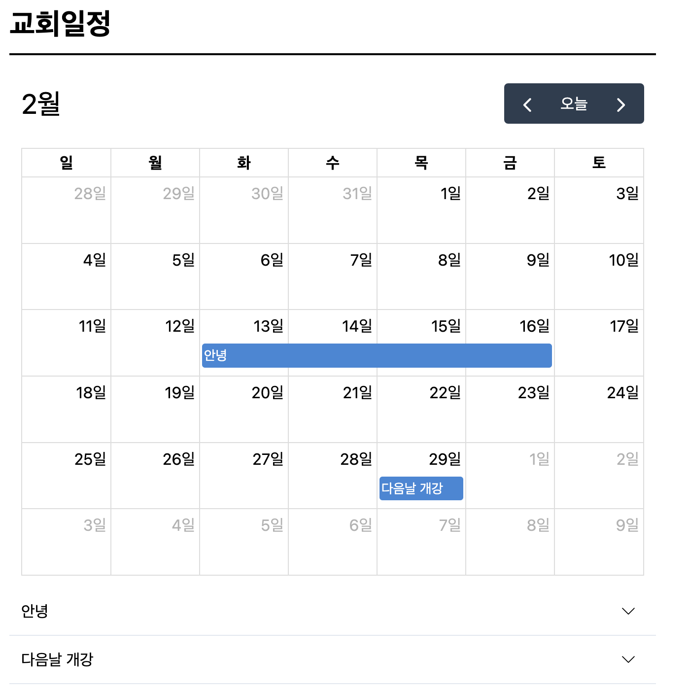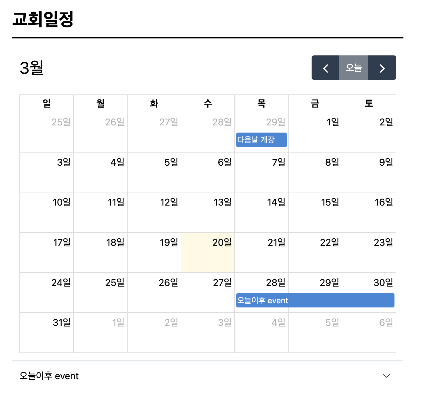 교회 일정 페이지에서는 FullCalendar에서 보여주는 달에 따라서 그 달에 해당하는 이벤트들을 밑에 보여주고자 함. (원래는 모든 이벤트들을 다 보여줬음)