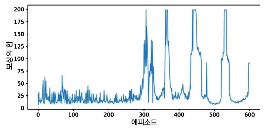 최대 보상에 도달하지만 곧바로 떨어지고, 몇 번 오르내리다가 안정되는 것처럼 보였으나 다시 점수가 급격히 떨어지는 경향