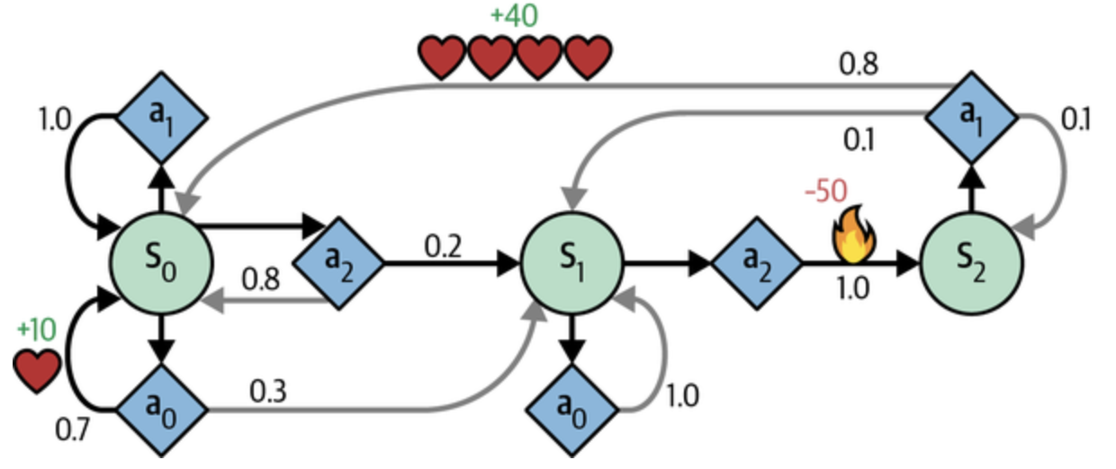 PG 알고리즘은 보상을 증가시키기 위해 정책을 직접적으로 최적화하지만 이번에 살펴볼 알고리즘은 덜 직접적임. 알고리즘을 이해하려면 먼저 마르코프 결정 과정(Markov Decision Process, MDP)에 대한 이해가 우선.