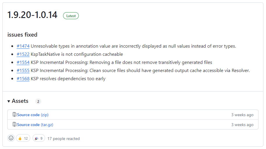 그렇기에 계속 생각해본바 프로젝트의 Kotlin 버전에 맞는 KSP 버전을 선택해야 합니다. KSP GitHub 페이지에서 출시 목록을 확인할 수 있습니다.
