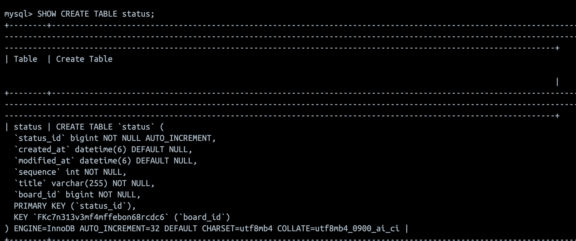 -- `status_id`를 AUTO_INCREMENT로 설정하고 기본 키로 추가