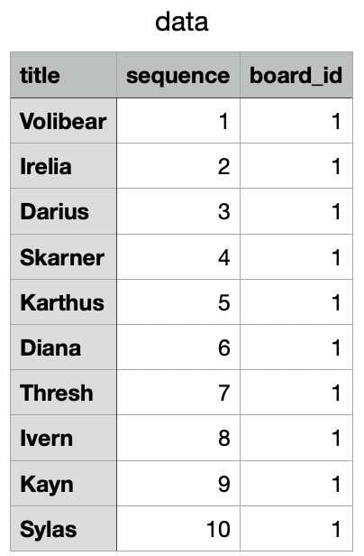 title, sequence, board_id 순으로 데이터가 저장되어있는데