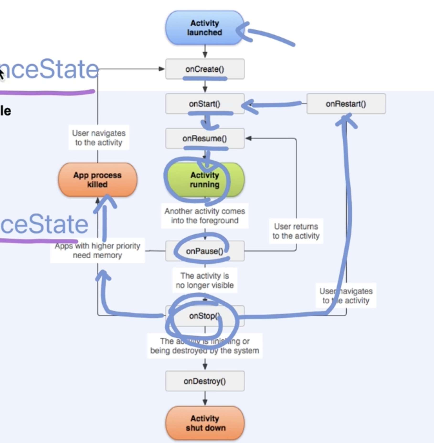Android Activity Lifecycle 인데, 앱은 여러 액티비티가 위 형태로 생기고 없어지면서 작동함.