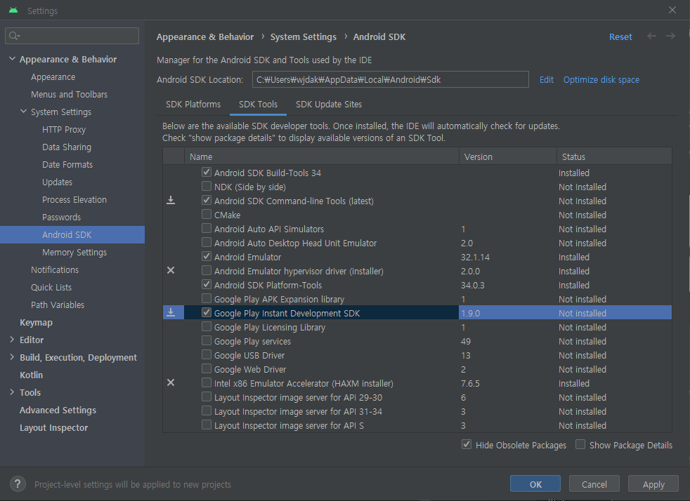 SDK Tool 에서 5가지를 아래와 같이 선택하자.