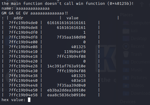 리턴 주소인 7ffc19b94df8를 win 함수 주소인 0x40125b로 바꾸면 win 함수가 호출되어 flag를 확인할 수 있다.