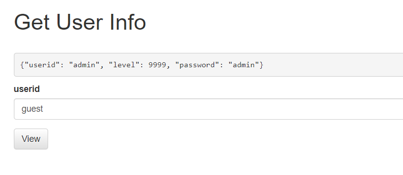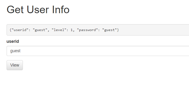 view 버튼을 누르면 userid에 입력한 사용자의 userid, level, password의 info가 출력된다.