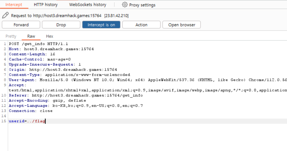 burp suite에서 intercept 후 userid값을 ../flag로 변경하고,