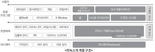 시스템 호출과 같은 API가 제공되며, 하드웨어 제어를 위한 디바이스 드라이버가 있다.