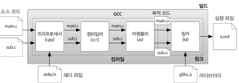 gcc는 리눅스의 기본 컴파일러이다. 리눅스 시스템이나 리눅스 커널 소스 코드 빌드용으로 주로 사용하며, 빌드할 경우 컴파일, 링킹 과정을 거쳐 실행파일이 만들어진다.