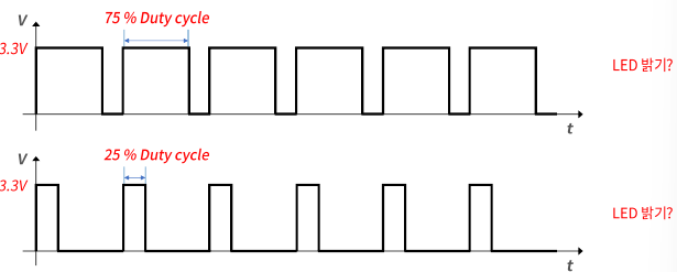 위에서 배운 Duty Cycle을 늘리면 LED의 밝기가 밝아지고, 줄일수록 밝기가 어두워지는 것이다.