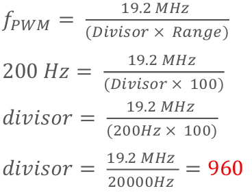 따라서 pwmSetRange(100); pwmSetClock(960);으로 작성하면 200 Hz 주파수를 가진 PWM 파형이 생성되는 것이다.