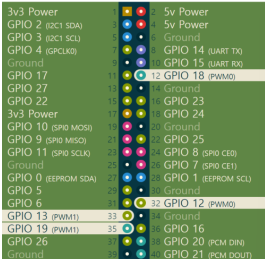 우리가 사용하는 라즈베리 파이에서는 GPIO12, GPIO18이 PWM0, GPIO13, GPIO19에 PWM1을 사용할 수 있도록 구성되어 있다.