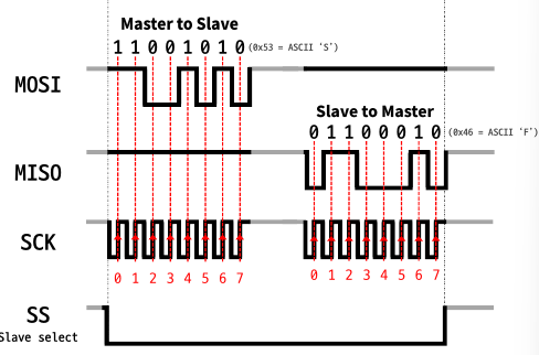 위 그림을 SPI에 맞게 구성하면 아래와 같은 그림이 되는데, MOSI는 Master입장에서 출력, Slave입장에서 입력이 되므로 먼저 데이터를 송신하게 되고, MISO는 반대이므로 데이터를 수신받은 후에 진행하게 된다.