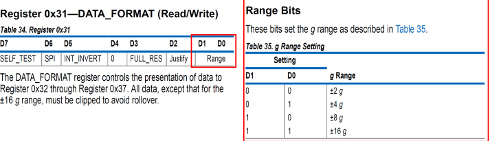 Range 비트 (D1 ~ D0): g(gravity) 범위를 설정한다. 범위는 ±2g, ±4g, ±8g, ±16g로 설정할 수 있으며, 설정에 따라 측정 가능한 최대 가속도가 달라진다.