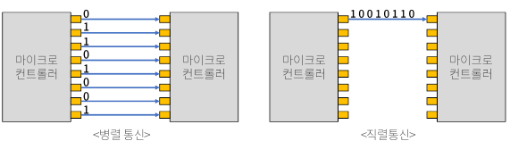 병렬 통신: 여러 개의 핀을 사용하여 한번에 여러 비트의 데이터를 전송