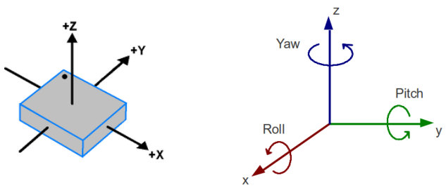 또한 가속도 센서의 x, y, z축을 측정하는 단위 값은 Roll, Pitch, Yaw라고 한다.