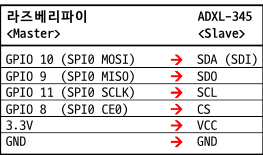 해당 예제에서는 라즈베리파이가 Master, ADXL-345가 Slave로 연결하게 되는 것이다.