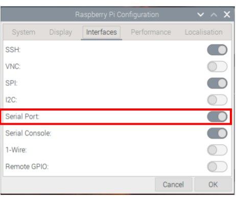 라즈베리파이에서 UART 핀을 활성화 하기 위해 아래와 같이 설정창에서 시리얼 포트 활성화가 필요하다.
