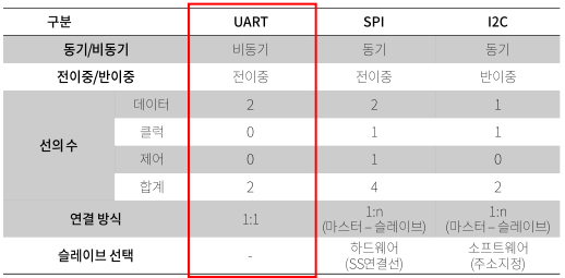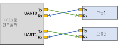 통신 구성이 1:1 방식으로 이루어져 있기에 만약 1:n 통신을 원할 경우 n개의 UART포트가 필요하다.