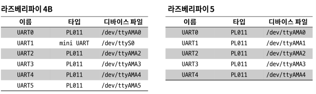 라즈베리파이 4B의 경우 6개의 UART, 라즈베리파이 5의 경우 5개의 UART가 존재한다.