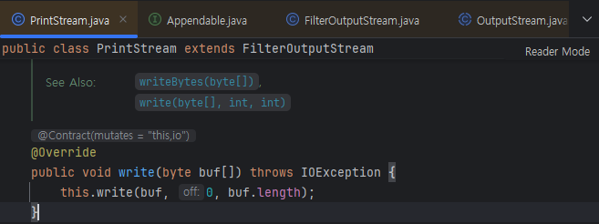 위에서 설명한 write 메서드의 경우 Chcecked 예외를 사용하도록 선언되어 있으므로 원칙적으로는 반드시 try ~ catch로 감싸주어야 컴파일이 가능하다.