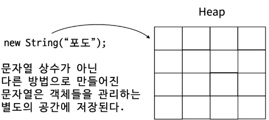 그리고 문자열 상수가 아닌 다른 방법으로 만들어진 String 객체는 자바 가상머신이 관리하는 Heap 공간에 저장된다.