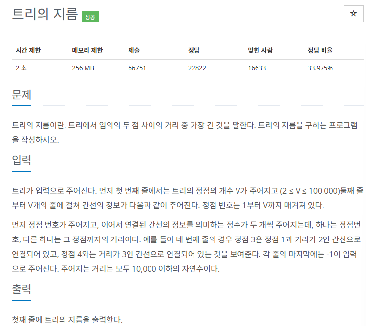 트리에서 두 점 사이의 거리 중 거리가 가장 긴 것을 트리의 지름이라고 하였다.