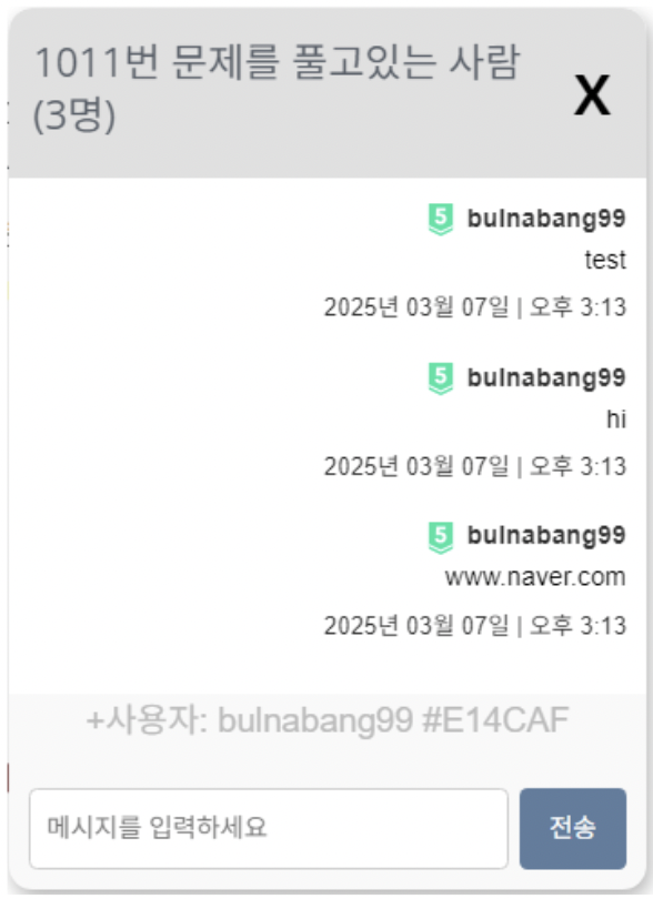 각 문제 페이지마다 고유한 채팅방이 생성되며, 같은 문제를 푸는 사람들끼리 대화할 수 있습니다.