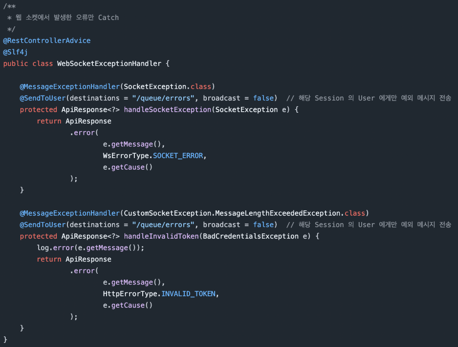 개별 사용자에게 발생한 예외 Message 를 전달하기 위해 @RestContollerAdvice 기반의 전역 예외처리 핸들러를 사용했습니다.