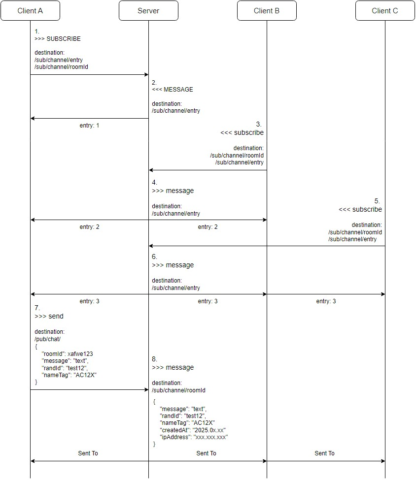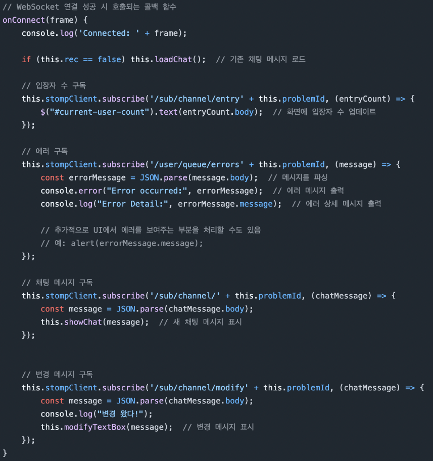 채팅의 생성, 삭제, 수정 시 새로고침 없이 실시간으로 데이터를 반영하기 위해 클라이언트에서 관련 API 경로를 STOMP 방식으로 구독했습니다.