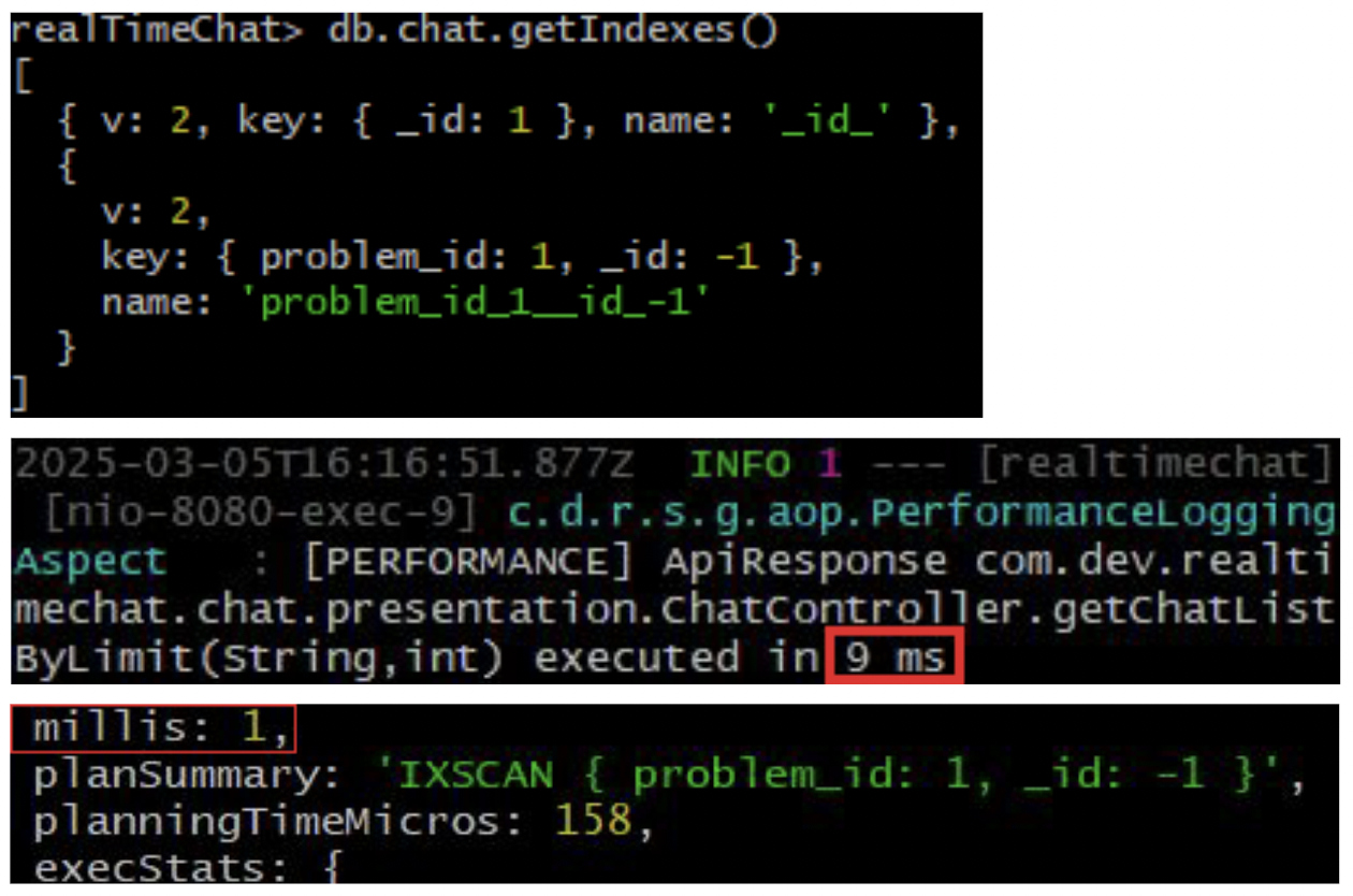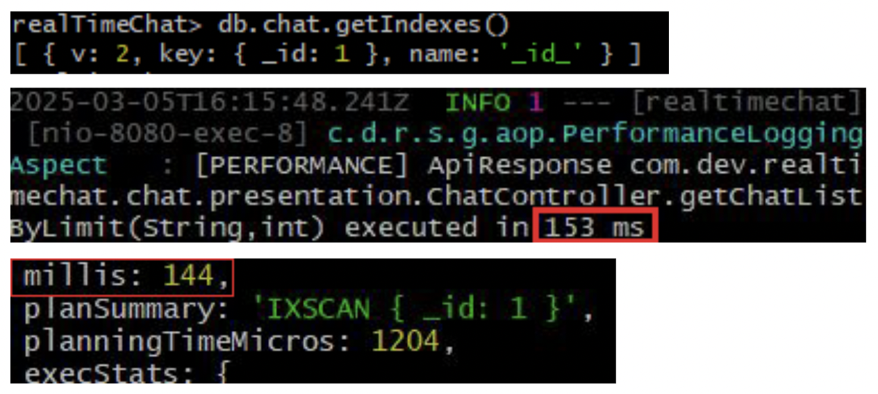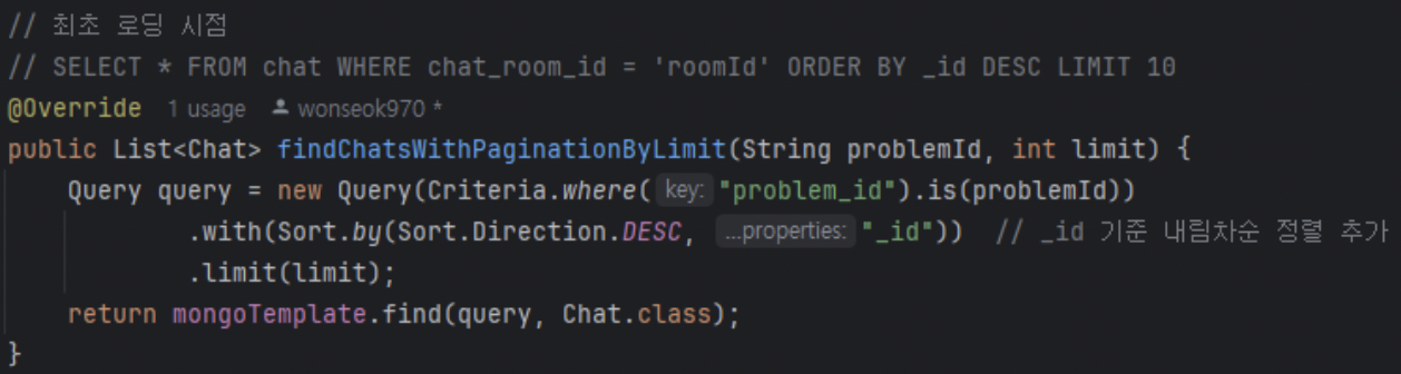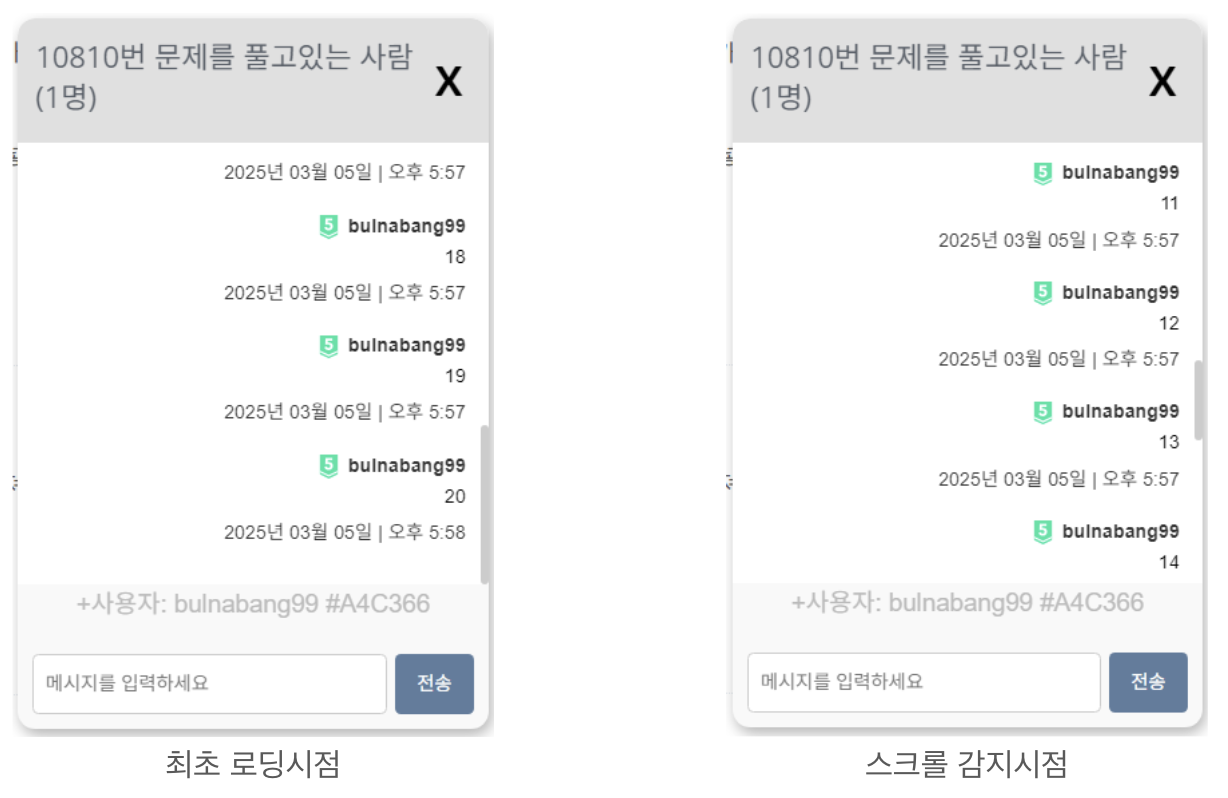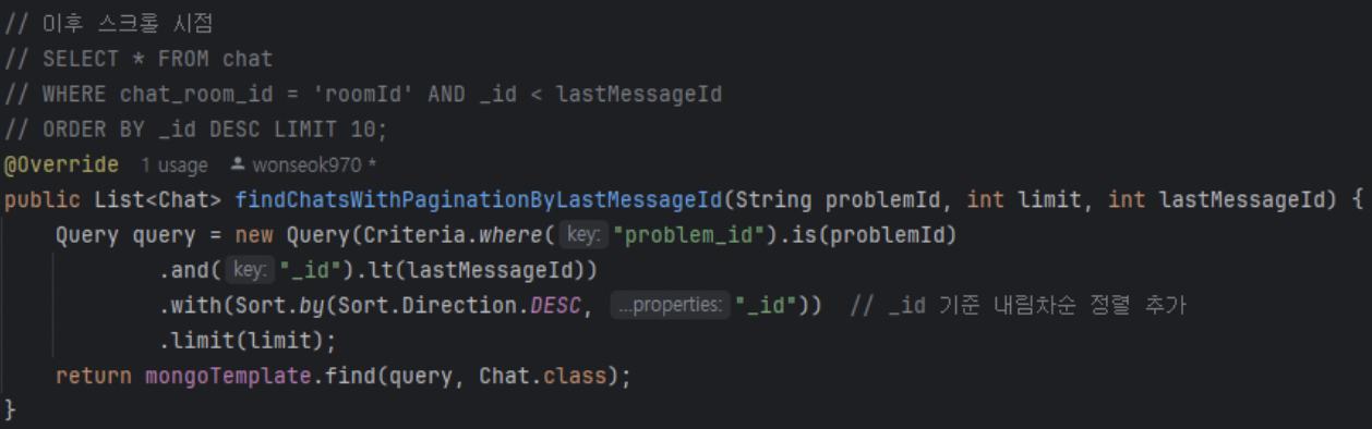 이러한 채팅 로딩 시간 복잡도를 감소시키고자 offset/limit 기반 페이지네이션(무한 스크롤)을 활용했으며, M개의 채팅을 모두 로딩하는 것이 아닌 10개로 고정시켜 각 채팅방에 로드되는 메시지를 상수 K(=10)로 줄일 수 있었습니다.