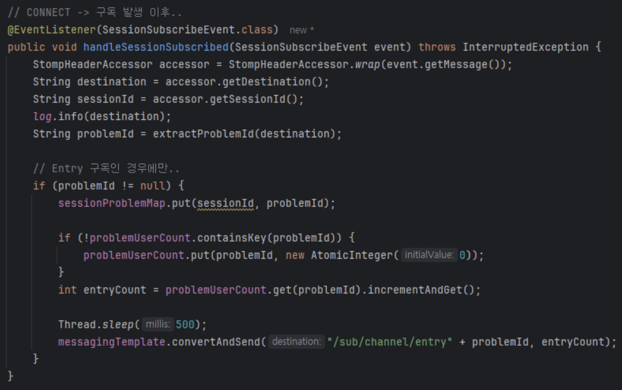 @EventListener를 활용해, SessionSubscribeEvent(CONNECT가 아닌) 감지 이후 접속자를 증가시키며, SessionDisconnectEvent 감지 이후 접속자 수를 감소시킴.