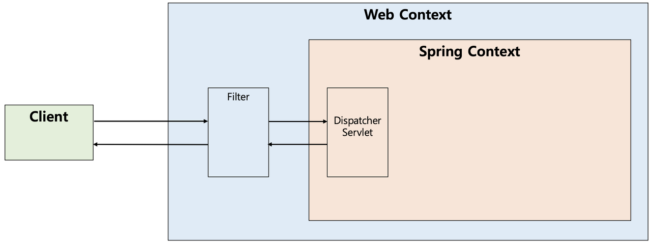 Dispatcher Servlet은 스프링의 가장 앞단에 존재하는 Front Controller로서, Filter는 스프링 범위 밖에서 처리가 되는 것으로, 스프링 컨테이너가 아닌 톰캣과 같은 웹 컨테이너(서블릿 컨테이너)에 의해 관리가 되는 것이고(스프링 빈으로 등록은 된다), 디스패처 서블릿 전/후에 처리하는 것이다. 이러한 과정을 그림으로 표현하면 다음과 같다.