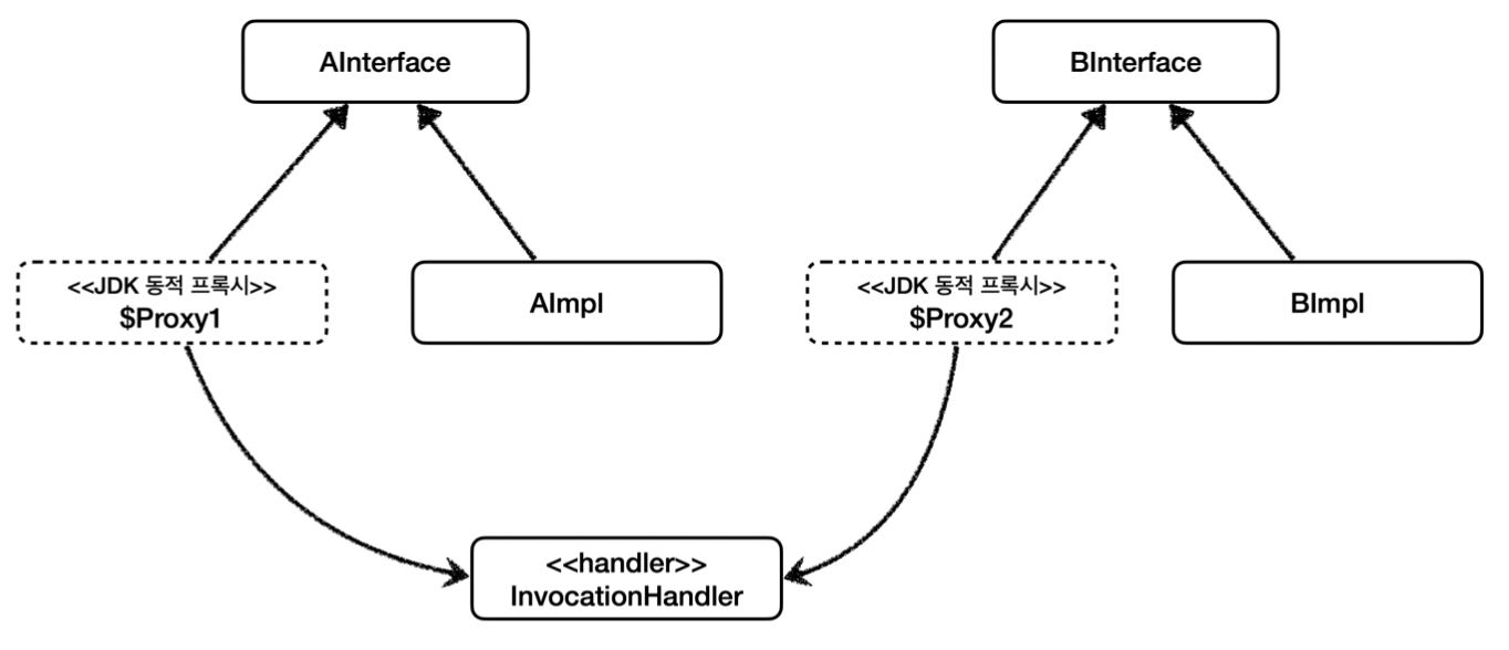 동적 프록시에 적용할 로직(AImp, BImpl)은, InvocationHandler 인터페이스를 구현하여 사용해야 한다.