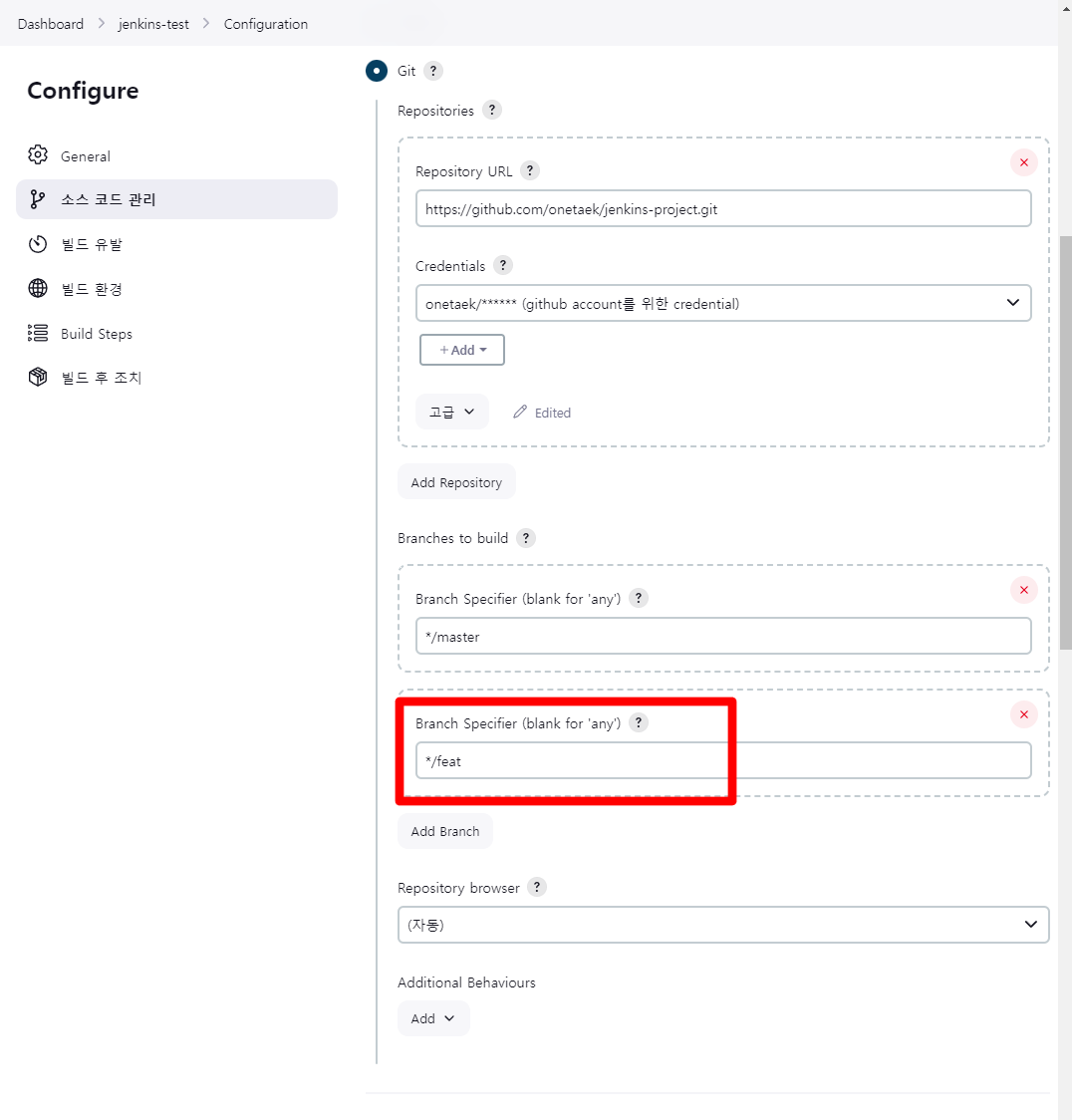 Branch Specifier에 /master 만 등록이 되어있어서 feat브랜치의 코드로 build되지 않는 문제로 /feat 도 Branch Specifier에 등록하여 해결