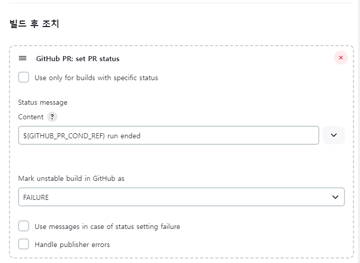 빌드 후 조치에 GitHub RP: set PR status를 통해 Build 성공 실패 여부에 따라 Pull Requst의 상태를 수정하기 위해 아래와 같이 설정